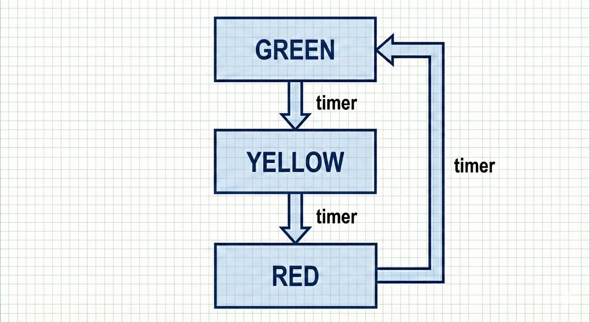 - Traffic light FSM: 3 states with timed transitions